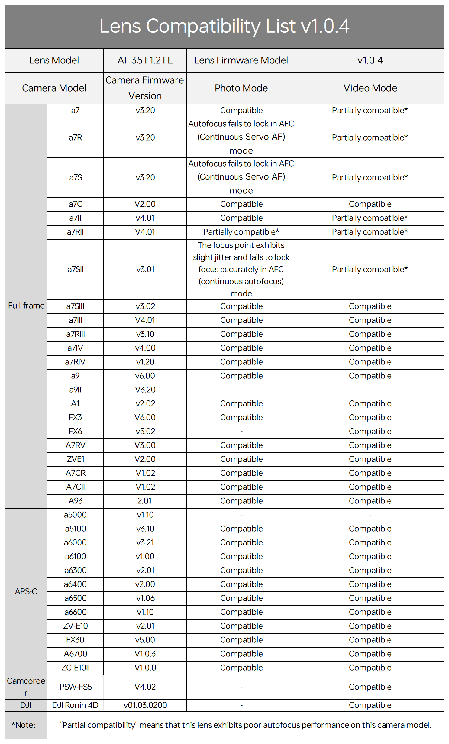 Lens is exceptional both optically an in terms of value. Only two issues. First is the internal floating optical assembly that freely moves about when there is no power provided by the camera body. Leaves me wondering about long term effects. Second, is the application to update the lens, and the lack of vetted instructions as to how to use it properly. Maybe a instructional youtube video would help the end user that could be linked by the application.